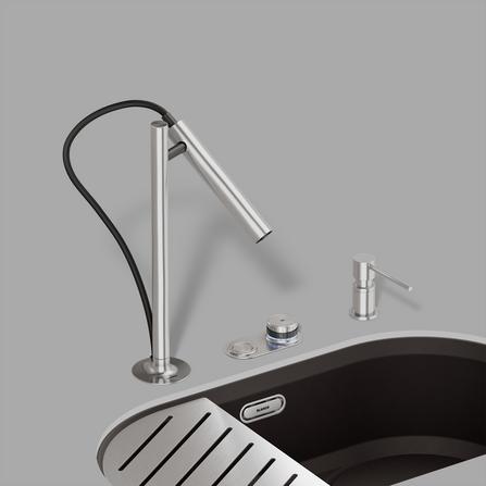 - Das Steuerpanel kann flexibel platziert werden, z.B. für Links- oder Rechtshänder, hinter, neben oder vor der Spüle, und sogar die Installation in der Front des Unterschranks ist möglich.