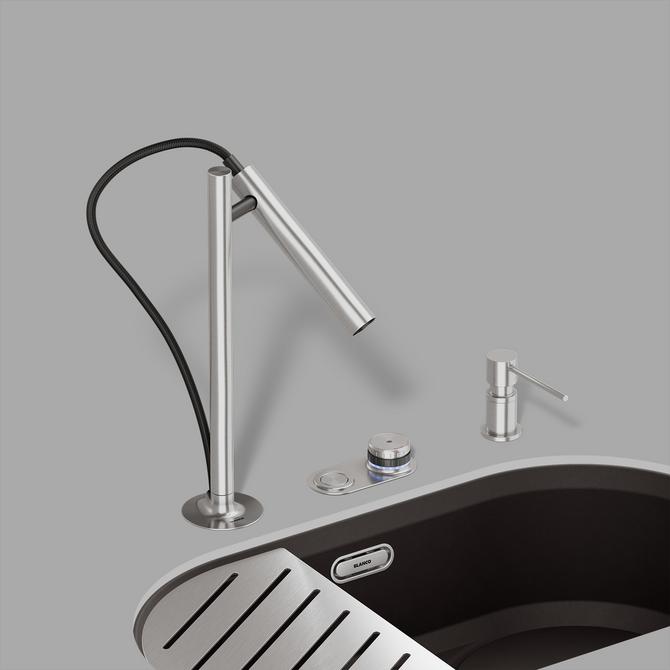 - Jeder LUNEOO wird mit zwei verschiedenen Basisplatten für die Fernsteuerung geliefert. Eine mit zusätzlichem Loch für eine BLANCO-Ablauffernbedienung und eine ohne. Wir empfehlen die BLANCO PushControl.
